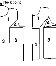 Cut the pattern and cut the 4 pieces from each other. Place them on another piece of paper in this way: Piece 1 stays in its place. Piece 2 is moved 3 cm downwards (That is the reason why you subtract 3 cm from the breast height). Piece 3 is temporarily moved 3 cm to the side. Piece 4 is turned with the centre in the armhole until it touches piece 3. Then you move piece 3 downwards until the corners meet, and a tuck appears. Piece 3 may not go as far down as piece 2, but you then draw a line from the side and to the middle of the space between piece 2 and 3. If the pattern only goes to the waist, you begin the knitting with shortened rows, but if it goes further down, you need not do this. The space between piece 2 and 3 is equal to the waist tuck.