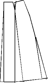 When you have designed the basic pattern for your skirt, you can make different fashions as figures 8 and 9 show. You can draw a vertical line through the middle of the tuck and down to the edge. Then cut the line and fold the pieces away from each other so you get more width. On figure 8, the pieces are folded until half of the tuck disappears. Besides, there is a little extra width in the front and the side. These pieces must only be half the size of the piece at the tuck, as the pieces will be twice as wide because you only draw 1/4 of the whole skirt.