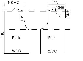 First, you mark out BL along a vertical line; and perpendicular to that, at its bottom end, you mark out 1/4 UC for the back, and 1/4 UC plus half the difference between CC and UC for the front. Having come so far, you turn again upwards at right angles. On top, the shoulder line is drawn perpendicular to the back line. Along it, you mark out NS, and from there, you turn down at right angles and mark out AH, which may be equal to NS or slightly more, if you want. At the last part of it, you round out outwards to meet the sideline. You find the neck by halving NS and use the same measurement vertically and horizontally. You may slant the shoulder line as shown in the drawing, but it is a matter of maximally 2 cm.