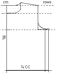 Before drawing the pattern, you must decide how much you will add to the measurements. Naturally, this is a question of taste, and also of whether the sweater is to be a thick sweater worn over something else, or whether it is to be worn close to the body. There is nothing wrong in knitting exactly to the measurements, for knitted work is elastic. But if, for instance, you want 1 cm free space all the way around, you add 6 - 7 cm to CC. You may also add much more. If you knit in the easiest way without rounding the armhole, you must add at least 14 cm and could well add 16 cm or more. A rule of thumb: The height of the armhole should be 2/9 of (CC + additions).