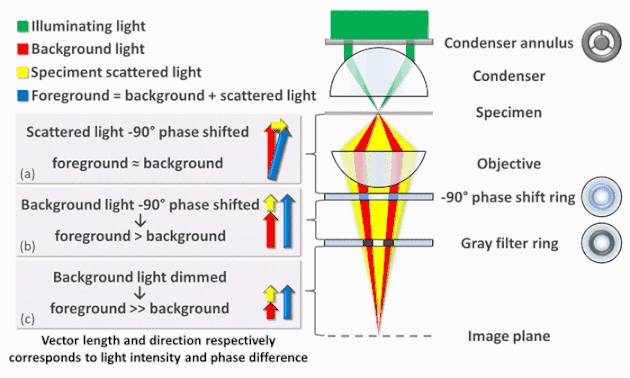 In a phase contrast microscope, the image contrast is improved in two steps. The background light is phase shifted -90° by passing it through a phase shift ring. This eliminates the phase difference between the background and the scattered light, leading to an increased intensity difference between foreground and background (b). To further increase contrast, the background is dimmed by a gray filter ring (c). Some of the scattered light will be phase shifted and dimmed by the rings. However, the background light is affected to a much greater extent, which creates the phase contrast effect.