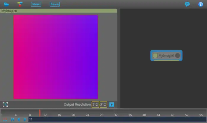 The names shown in the nodes menu are the scripts' file names. To start the execution of our script click in MyImage entry. A node called MyImage0 is added to the node-graph. Clicking on the output button, the squared button on the right side of the node, opens the output window showing the output of our node. See screenshot below.