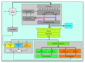| Block diagrams of the IBM Cell processor. The Cell processor has 8 SPE cores (left) and 1 PPE core (right). The PPE core is the primary core, and controls the behavior of the SPE cores. | |