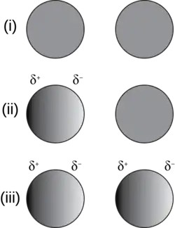 A schematic of how a (i) two neutral atoms can have an attractive electrostatic interaction when (ii) the electron density of one atom (left) spontaneously polarizes to form an instantaneous dipole. (iii) This polarizes the neighbouring atom.