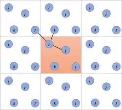 A particle in a periodic cell has non-bonded interactions with the other particles both in the original cell, and also in the surrounding cells (the periodic images of the original cell). The non-bonded potential energy () can be written as: