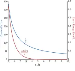 where is a tunable constant chosen to ensure the electrostatic interaction decays to zero at the desired value. In this case, the term corresponds to the short-range interaction potential, which decays quickly to zero through evaluation in real space, while the term corresponds to the long-range interaction potential, which is more easily evaluated in reciprocal space.[2] This potential is evaluated as a sum of all possible charge-charge interactions across the infinite periodic images of the simulation cell. In reciprocal space, these interactions converge quickly, allowing efficient computation through application of fast Fourier transforms.[1] The sum of all charge-charge interactions at long range throughout all periodic images of the simulation system can be represented as