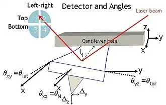 The cantilever can bend in several ways, which is detected by the quadrant photo detector that most AFMs are equipped with. Normal topography signal is given by 'normal' deflection of the cantilever tip in the x-z direction, and detected by the left-right (or A-B) detector coupling quadrants as .