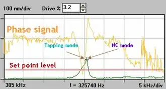 Non-contact mode: If we oscillate the cantilever at a higher frequency than its free resonance and use the feedback loop to maintain a oscillation amplitude setpoint slightly lower than that of the free oscillation, it will move the tip down until the attractive forces lower the resonance frequency and makes the oscillation amplitude drop to the setpoint level.