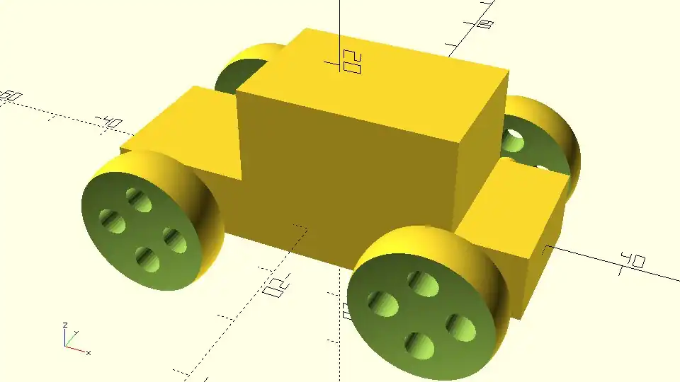 | Try removing some material from the wheels by subtracting four cylinders that are perpendicular to the wheel. The cylinders should be placed at half the wheel radius and be equally spaced. Introduce a cylinder_radius and a cylinder_height variable. The value of cylinder_height should be appropriate so that the cylinders are always longer than the thickness of the material they are removed from. |
