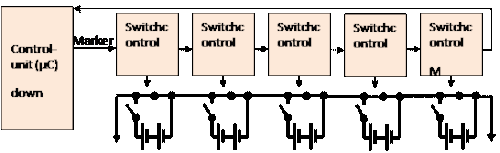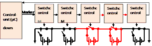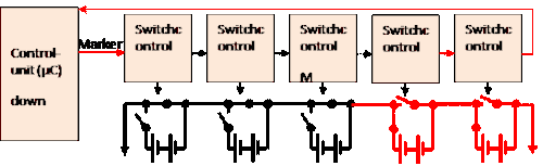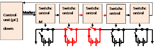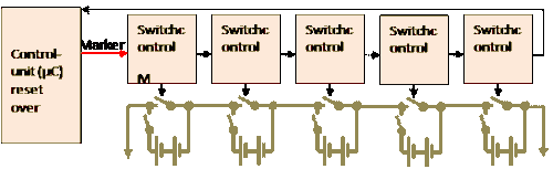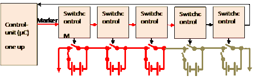 In idle state, all switches of all battery packs are tristate and thus safe. For starting operation, the control head shall put out a "marker" signal and 100ms an "idle" signal to wake up the battery pack. The switching cell next to the control head will store this "marker" information.