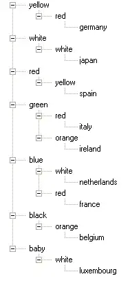 FLAGS/LOC,A,B,C,D,E,F,G,H,I BELGIUM,BLACK,YELLOW,ORANGE,BLACK,YELLOW,ORANGE,BLACK,YELLOW,ORANGE FRANCE,BLUE,WHITE,RED,BLUE,WHITE,RED,BLUE,WHITE,RED GERMANY,BLACK,BLACK,BLACK,RED,RED,RED,YELLOW,YELLOW,YELLOW IRELAND,GREEN,WHITE,ORANGE,GREEN,WHITE,ORANGE,GREEN,WHITE,ORANGE ITALY,GREEN,WHITE,RED,GREEN,WHITE,RED,GREEN,WHITE,RED JAPAN,WHITE,WHITE,WHITE,WHITE,RED,WHITE,WHITE,WHITE,WHITE LUXEMBOURG,RED,RED,RED,WHITE,WHITE,WHITE,BABY,BABY,BABY NETHERLANDS,RED,RED,RED,WHITE,WHITE,WHITE,BLUE,BLUE,BLUE SPAIN,RED,RED,RED,YELLOW,YELLOW,YELLOW,RED,RED,RED HELIGOLAND,GREEN,GREEN,GREEN,RED,RED,RED,WHITE,WHITE,WHITE