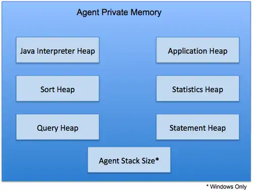 • Application Heap – Used for sharing information between agents working on behalf of the same request (minimal for non-partitioned databases that are not using intra-parallelism.) It is also used to store descriptor information for temporary tables.