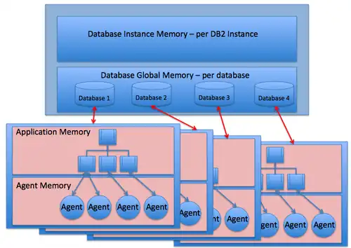 DB2 manages memory in four distinct chunks. The memory can be thought as of being organized from the ‘top down’. There is memory allocated for the Database Instance – the Database Management System (DBMS) that handles all the individual databases in the DBMS and all the instance level tasks and activities. Below this there is memory allocated for each individual database that holds things like the database buffer pool and recovery information. For each set of applications associated with a database there is a memory allocation, and within the applications there are things DB2 calls agents that are like little subroutines or utilities that do the work for the applications. So from the top down, we have: