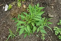 | Bidens frondosa (devil's beggarticks) is an annual native plant found naturally in low meadows but also a common weed of gardens. The plants emerge in mid spring, flowering in mid to late summer, then producing seeds that stick to clothing.