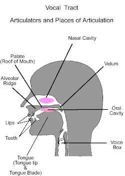 In vowels, the larynx is a 'source' which converts air pressure into a series of soud waves, generating the 'pitch'. The upper vocal tract shapes and molds the sound originating from the larynx, causing some integer multiples of the fundamental frequency ('harmonics') to resonate ('formants'). Vowel quality is primarily determined by how wide open the mouth is (jaw height), whether the tongue comes closer to the roof of the mouth at the hard palate (front) or soft palate (back), and whether the lips are rounded. In consonants, a sharp constrictipon of airflow creates a pressure differential in the upper vocal tract. Consonants are named by the articulator at which the primary constriction occurs, as well as how tight the constriction is, and the status of the larynx. For example, /p/ is called a voiceless labial stop because the primary consonantal constriction occurs at the lips (labial), the lips are completely closed so they completely stop all airflow, and the larynx is not generating modal voicing.