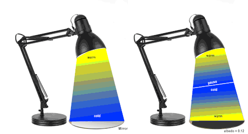 Now imagine that the surface is rather a grayish color (albedo = 0.12), with only 12% of the light reflected back into space. In this case, the surface will absorb the energy from the light, and the surface will warm over time. So that the coldest point between the lamp and the surface would no longer be the surface, but be somewhere above the surface. This cold point or inflection point is known as a pause. A hill on this gray surface will cool with elevation as you approach this colder layer (or pause) above the surface. The moon is an example of this simple style of a planetary body that lacks an atmosphere, it has a low albedo of 0.12. The surface of the moon oscillates between extremely cold and hot temperatures, with nighttime temperatures dropping below −150 degrees Celsius, below the freezing point of dry ice, and daytime temperatures well above 106 degrees Celsius, higher than the boiling point of water. This great oscillation and range of daily temperatures is a result of the lack of any absorption of sun light by gasses above the surface of the moon. When the sun is shining on the surface of the moon temperatures soar, and when the moon turns from the sun, temperatures plunge in the dark. Earth would have a similar great oscillation of temperatures if not for its atmosphere.