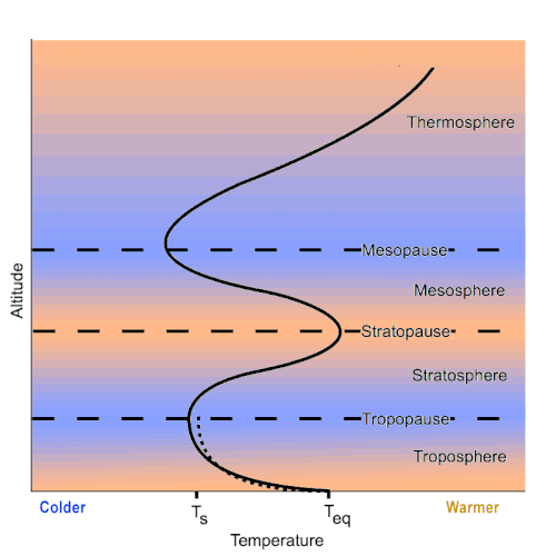 Oxygen plays an important role in Earth’s atmospheric temperatures. Oxygen, Nitrogen and Argon, are the most abundant gasses on Earth. Oxygen blocks ultraviolet (high energy) light from the sun. Like a second surface above the ground, these gasses are heated by the sun’s high energy ultraviolet rays, near the top of the stratosphere (50 km above the Earth). Ozone blocks more of the incoming ultraviolet sun light resulting in a warmer layer. This warm layer above the surface of the Earth is known as the Stratopause, and marks the top of the Stratosphere. The air is denser below the Stratopause. Temperatures are cooler above and below this layer, resulting in two cold layers below and above this heated zone high in Earth’s atmosphere. If the atmosphere lacked oxygen, or other gasses that absorb high energy ultraviolet rays, the temperature profile would lack these two distinct cold layers, and have only a one cold layer. The presence of oxygen and ozone in the atmosphere results in temperatures increasing below the Stratopause, within the high Stratosphere of the atmosphere. Note that the temperatures in the Stratopause are still pretty cold compared to Earth’s surface, reaching around −15 degrees Celsius, but this is much higher than the two very cold layers in the atmosphere. The Tropopause, which is about 15 kilometers above the Earth’s surface, dips to −51 degrees Celsius, while the Mesopause, above the Stratosphere at 80 kilometers is even colder −100 degrees Celsius. These three layers, the two cold layers, the Mesopause and Tropopause, and single warmer layer, Stratopause, divide the atmosphere into four layers; the lowest layer is the Troposphere, then Stratosphere, Mesosphere, and highest Thermosphere, with the highest temperatures, but lowest pressures of Earth’s atmosphere.