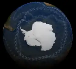 The last surface ocean current is by far one of the most important: the Antarctic Circumpolar Current, also known as the West Wind Drift, which encircles the coast of Antarctica. Most of the currents we have discussed are a product of the rotation of the Earth, as well as the arrangement of the continents, which block the motion of the ocean toward the east, resulting in the many gyre discussed above. The Antarctic Circumpolar Current flows toward the east, and because there is no major landmass in its path, continues this flow in perpetuity, always encircling the coast of Antarctic. These ocean waters remain cold, bitterly so compared to other ocean currents, because surface ocean currents do not loop toward warmer equatorial regions of the planet.