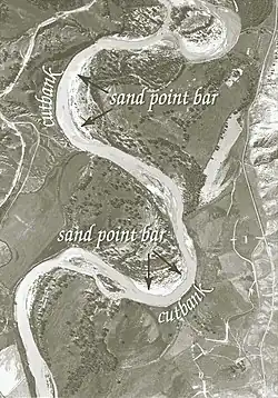 Over time the river will continue to cut into one side of the bank on the high velocity side, while the other side of the river will grow with the deposition of sand and other sediments, on the low velocity side. The river will alternate downstream with the cut bank and point bar on differing sides of the river. Eventually when the cut bank continues to be eroded the river will increase the bend, until contacting another cut bank along the course of the river. This bypass forms an oxbox lake, an isolated section of river that has been bypassed by the main river channel.