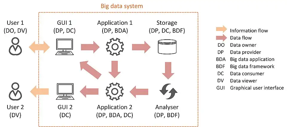 Two users User 1 and User 2 are connected to a big data system. They both interact with it by means of a graphical user interface. Let us imagine GUI 1 is a website browsed by User 1, and GUI 2 is a desktop application run by User 2. Application 1 and Application 2 are two big data applications. Storage and Analyser are respectively a data platform framework and a processing framework. Information entered by User 1 is transferred to Application 1 by GUI 1. Application 1 saves it in Storage and relays it to Application 2. Analyser uninterruptedly analyses data contained in Storage and sends its analysis also to Application 2. With all these inputs on hand, Application 2 executes a certain algorithm and transmits the results to GUI 1 and GUI 2, which, lastly, reveal them to their users. In this scenario, many actors play multiple roles. For instance, User 1 is a data owner and a data viewer, and Storage is a data provider, a data consumer, and a big data framework.