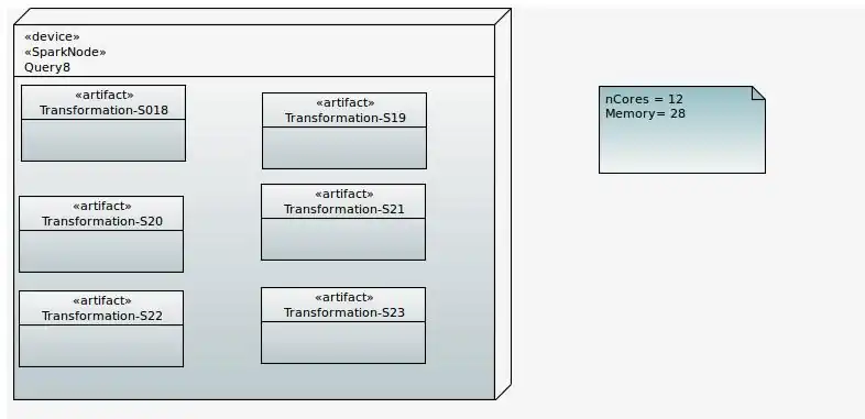 Each UML partition is mapped to a computational resource in the UML deployment diagram following the scheduling policy defined for the topology. Figure 4 shows the deployment diagram, which complements the previous activity diagram. Each computational resource is stereotyped as SparkNode (equivalent to GaExecHost) and defines its resource multiplicity, i.e., number of cores. This stereotype is inherited from MARTE GQAM.