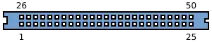 The pins of a CompactFlash card are arranged in a 2×25 rectangular array with 0.05 inch spacing (50 mils or 1.27mm). CF cards have slots on each side, which are used to ensure the card cannot be inserted upside down or backwards. When looking into the card's connector, the wider slot is on the left when oriented as in the image below.