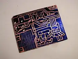 We try to cover as much surface. Thus it is not a slender connections between holes, but on the contrary, etching narrow gaps between the copper areas. It is important for the success of the etching and the etching solution for saving. Zabarvíme areas that do not lead nowhere. For a slim gap between the joints can tint the entire surface, and then carved a groove into the paint with a sharp object by the ruler.
