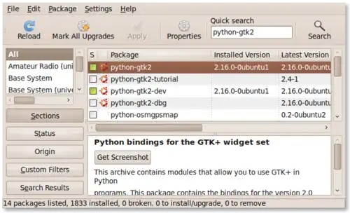 The easiest way to install PyGTK is to use your system's package manager to download and install `python-gtk2` (see screenshot). This should automatically sort out all GTK dependencies. Once completed, test that it has been installed properly by typing `import gtk` in a Python interpreter - if there are no errors, then you're good to go.