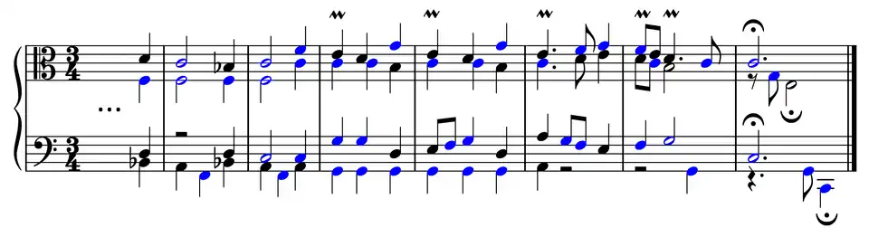 In harmony theory, the four Pythagorean tones are of great importance, as they form the framework of one of the most frequently used final cadences consisting of tonic, subdominant, dominant and tonic. The folowing example shows the cadence C major - F major - G major - C major with the respective root of the four chords in the bass voice.