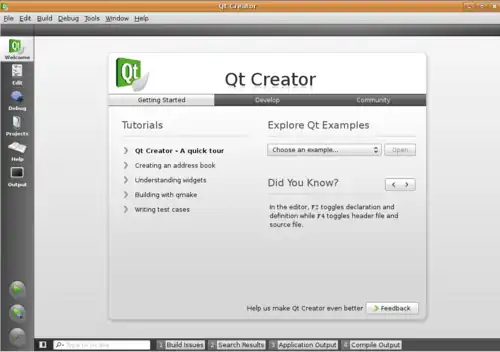 When the program is installed and Qt Creator is launched we see the Welcome window. In this window anyone can try out examples or make some tutorials.