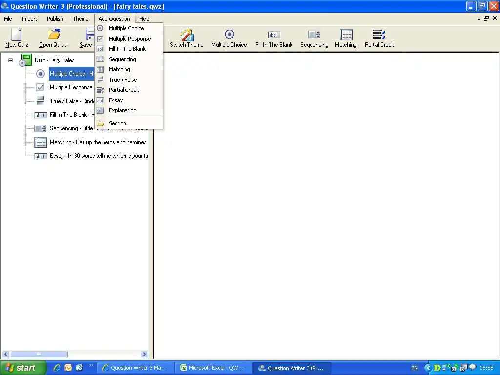 It is easy to add a question to your quiz. This can be done either by clicking on Add Question on the menu bar