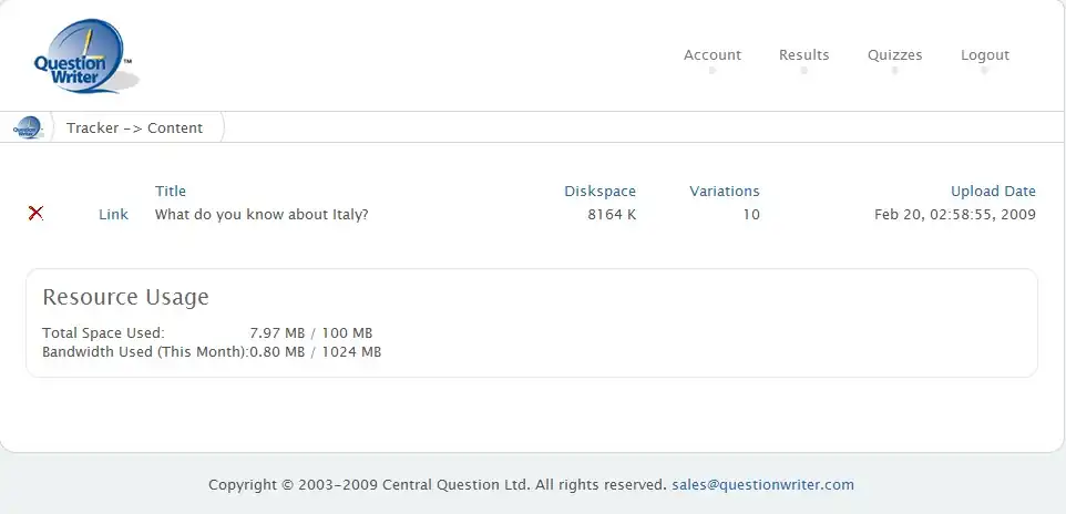 A free Question Writer Tracker account provides 100MB free storage space and 1GB (1024MB) free bandwidth per month. This is enough space and transfer capacity for most uses, but if you find you need more - you have two options.