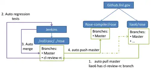 The ROSE project uses a workflow that automates the central principles of continuous integration in order to make integrating the work from different developers a non-event. Because the integration process only integrates with ROSE the changes that passes all tests we encourage all developers to stay in sync with the latest version.