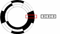 One of the problems with using a binary encoding scheme is detector error. There's no guarantee that every channel is going to transition at the same time, which can cause a misread of a segment's ID. If the section of the disc below the detector is transitioning from one segment to the next, briefly the decoder might read only part of the bits correctly. Assume a standard eight-segment binary encoding scheme, where segments are numbered from 0 to 8 sequentially: if the transition from segment 000 to segment 001 doesn't read the rising edge correctly, your read is off by one space, which for the moment is negligible. If, however, it's transitioning from segment 011 to segment 100, and the least significant bit is read in first, briefly your controller will think it's transitioned to 010, in the complete opposite direction. If the most significant bit is read in first, it'll think it jumped from 011 to 111, on the complete opposite side of the wheel. Transition errors when a single bit changes can often be considered negligible, as the error in calculated position is 1. Errors from multi-bit transitions can be catastrophic.
