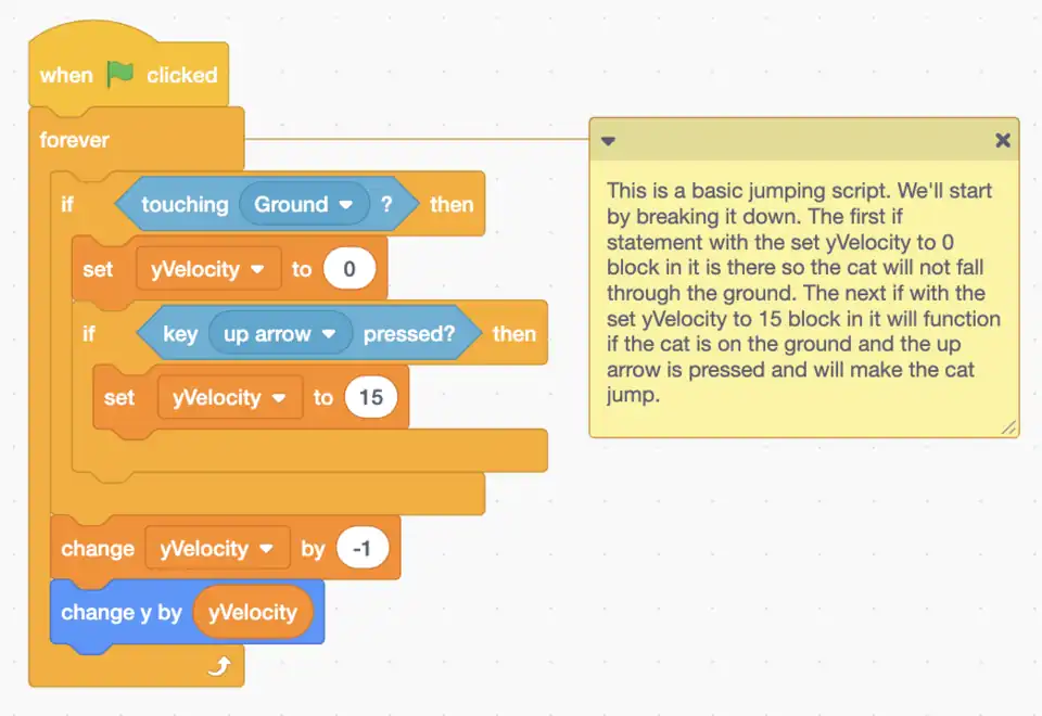 Text of the comment block (if you can't read it): This is a basic jumping script. We'll start by breaking it down. The first if statement with the set yVelocity to 0 block in it is there so the cat will not fall through the ground. The next if with the set yVelocity to 15 block in it will function if the cat is on the ground and the up arrow is pressed and will make the cat jump. Out of that set of ifs the change y by yVelocity will make him fall or rise depending on the velocity variable. And the change yVelocity by -1 is gravity.