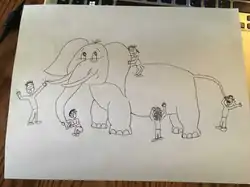 - The facilitator briefly shares what is going on in the image. Each blind person feels a different part of the elephant's body; and exclaims “It’s a spear, It’s a snake, It’s a wall, It’s a tree stump, It’s a fan, It’s a rope”.
