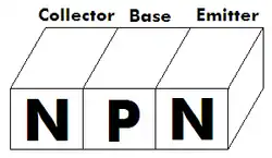 A Bipolar Junction Transistor is made up of a piece of silicon that has been treated to create a 'channel' in the silicon. First, an undoped (untreated) piece of silicon is selected (undoped silicon acts as an insulator, preventing the flow of current). Next, a process is used to create an N-type channel in the silicon. This is silicon that has an overabundance of negative charge carriers (electrons). A second channel is created in the first, this time with P-type silicon. P-type silicon carries current because of the overabundance of positive charge carriers ('holes', they're called). The process has created three regions in the silicon, an N-type region, a P-type region, and another N-type region. The base terminal is connected to the P-type region, while the collector and emitter are connected to the opposing N-type regions.