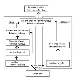 The auditory nerve fibers provide innervation to two main cochlear nuclei within the brainstem: the cochlear nucleus magnocellularis the cochlear nucleus angularis. The neurons in the nucleus magnocellularis exhibit phase-locking but are relatively insensitive to variations in sound pressure. On the other hand, the neurons in the nucleus angularis show poor or no phase-locking but are sensitive to sound pressure fluctuations. These two nuclei serve as the initial points for separate yet parallel pathways to the inferior colliculus. The pathway from the nucleus magnocellularis processes interaural time differences (ITDs), while the pathway from the nucleus angularis processes interaural intensity differences (IIDs).