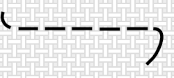 Back stitches pass through the fabric ground in an encircling motion. The needle in the simplest backstitch comes up from the back of the fabric, makes a stitch to the right going back to the back of the fabric, then passes behind the first stitch and comes up to the front of the fabric to the left of the first stitch. The needle then goes back to the back of the fabric through the same hole the stitch first came up from. The needle then repeats the movement to the left of the stitches and continues.