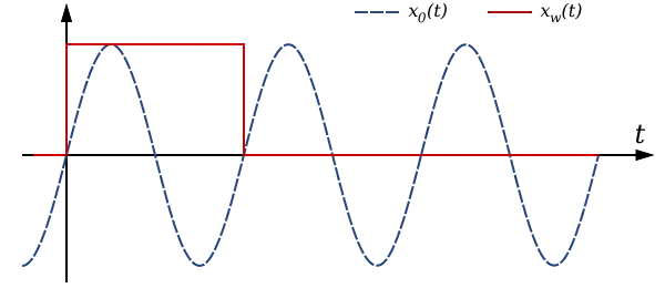 The signal x(t) is given by the following infinite sinusoid, x0(t), and windowing function, xw(t):