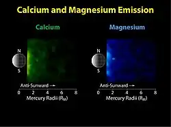 Sodium, potassium and calcium were discovered in the atmosphere during the 1980–1990s, and are believed to result primarily from the vaporization of surface rock struck by micrometeorite impacts.[58] In 2008 magnesium was discovered by MESSENGER probe.[59] Studies indicate that, at times, sodium emissions are localized at points that correspond to the planet's magnetic poles. This would indicate an interaction between the magnetosphere and the planet's surface.[60]