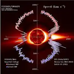 The solar wind is a stream of charged particles ejected from the upper atmosphere of the Sun. It mostly consists of electrons and protons with energies usually between 10 and 100 eV. The stream of particles varies in temperature and speed over time. These particles can escape the Sun's gravity because of their high kinetic energy and the high temperature of the corona.