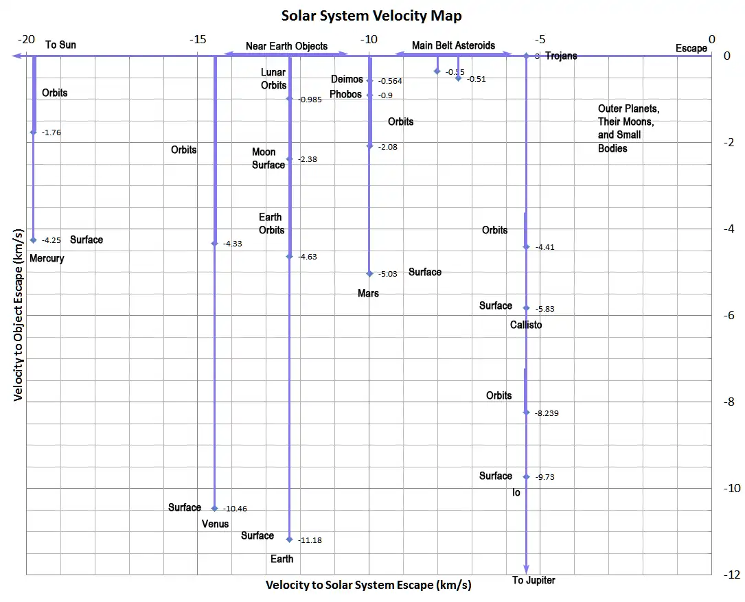 Figure 2-3 presents approximate minimum ideal delta-V values in km/s. The values are relative to escape from the Sun on the horizontal axis, and escape from planets and some satellites and asteroids out to Jupiter on the vertical axis. The scales are different for the axes. Other tables and graphs can be found in the Delta-V Budget article, or calculated individually for particular missions.