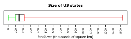 Figure 2.3(d) is a more sophisticated boxplot of the same data. Here, notches have been drawn on the box: these are useful for comparing the medians in different boxplots. The whiskers have been shortened so that they do not include points considered as outliers. There are various ways of defining these outliers automatically. This figure is based on a convention that considers outlying points as those more than one and a half times the IQR from either side of the box. However it is often more informative to identify and inspect interesting points (including outliers) by visual inspection. For example, in Figure 2.1a it is clear that Alaska and (to a lesser extent) Texas are unusually large states, but that California (identified as an outlier by this automatic procedure) is not so set-apart from the rest.