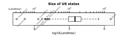 Sometimes, plotting on a different scale (e.g. a logarithmic scale) can be more informative. We can visualise this either as a plot with a non-linear (e.g. logarithmic) axis, or as a conventional plot of a transformed variable (e.g. a plot of log(my.variable) on a standard, linear axis). Figure 2.1(b) illustrates this point: the left axis marks the state areas, the right axis marks the logarithm of the state areas. This sort of rescaling can highlight quite different features of a variable. In this case, it seems clear that there are a batch of nine states which seem distinctly smaller than most, and while Alaska still seems extraordinarily large, Texas does not seem so unusual in that respect. This is also reflected by the automatic labelling of outliers in the log-transformed variable.