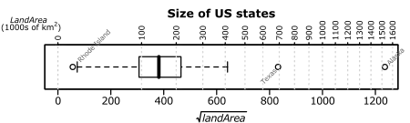 There are other common transformations, for example, the square-root transformation (often used for count data). This may be more appropriate for state areas, if the limiting factor for state size is (e.g.) the distance across the state, or factors associated with it (e.g. the length of time to cross from one side to another). Figure 2.1c shows a sqrt rescaling of the data. You can see that in some sense this is less extreme than the log transformation...