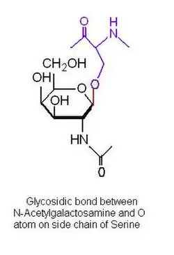 - O-linked Oligosaccharide: The most common O-glycosidic attachment involves the disaccharide core β-galactosyl-(1->3)-α-N-acetylgalactosamine linked to the OH group of either Ser or Thr. O-linked Oligosaccharides are synthesized in the Golgi apparatus by the serial addition of monnosaccharide units to a completed polypeptide chain. Synthesis starts with the transfer of GalNAc to a Ser and Thr residue on the polypeptide. N-linked oligosaccharides are transferred to an Asn in a specific amino acid sequence, but O-glycosulated Ser and Thr residues are not members of any common sequence. Instead, the locations of glycosylation sites are specified only by the secondary or tertiary structure of the polypeptide. O-glycosylation continues with stepwise addition of sugars by the corresponding glycosyltransferases.