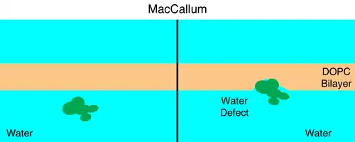 One of the most important things about this particular model is the formation of water defects in the bilayer, which are local deformations in the membrane which allow for water to penetrate into the bilayer core and keep polar and charged groups hydrated in the partitioning of polar and charged molecules into the lipid bilayer membrane.[5]