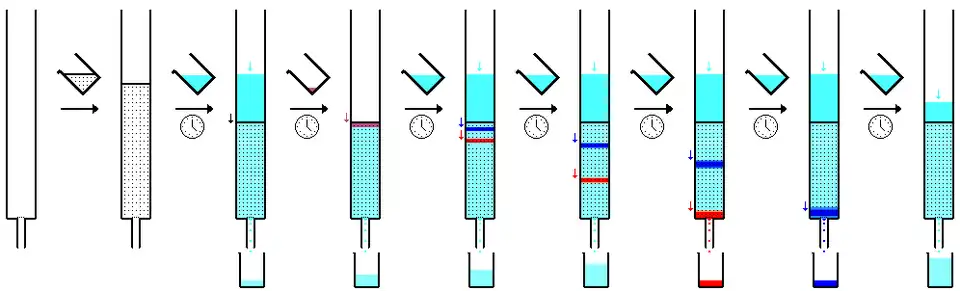 The chemical compounds are separated and collected within the column. The separated sample can then be tested for purity and other properties. As the sample is applied to the top of the column, it is also washed with a solvent. As the sample moves over the solid phase in the column, the different molecules or compounds in the sample will begin to separate from each other into zones. The compounds in the sample will bind to the solid phase, but then the sample will also release from the solid phase and then bind to the liquid solvent that passes over it. This is a continuous process. A compound will bind to the solid phase, then release and bind to the solvent. it will then rebind back to the solid phase, and again rebind to the liquid solvent. This process keeps occurring as the compound moves down the column. Different molecules in the sample will have a different binding affinity to the solid phase or the liquid phase, these differences in affinity is what allows the molecule in a mixture to travel at different speeds and separate from the other compounds.(NOTE :*The preceding section was a description of column chromatography for organic chemistry.) This method is sometimes called reverse phase chromatography in biochemistry.