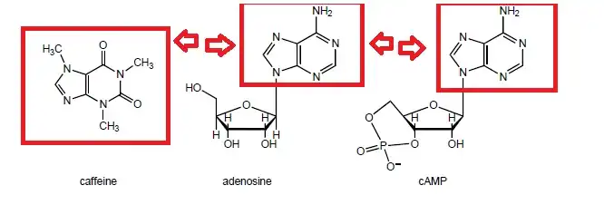 Pharmaceutical drugs work the same way Enzymes work. They bind to a specific binding site that either inhibits or activates a specific biological action. Caffeine for example is a really known molecule that a lot of people use every day, by drinking coffee or tea, to keep them awake. The reason behind the relationship between Caffeine and alertness and wakefulness is the big structural similarity between the caffeine molecule, adenosine and cyclic adenosine phosphate. The structures similarity allows caffeine molecules to bind to the same binding site of receptors or enzymes that reacts with adenosine derivatives. Adenosine has a very important role in the regulation of brain activity. The human brain builds up adenosine molecules during the day. When the level of built up adenosine increases in the human brain, adenosine starts binding to its binding sites (receptors) in the human brain which activates mechanisms that lead to drowsiness and sleep. Since caffeine has the same structural molecule it binds to the same receptors that adenosine binds to, preventing adenosine to bind to that specific receptor in the human brain and delaying the sleeping and drowsiness process.